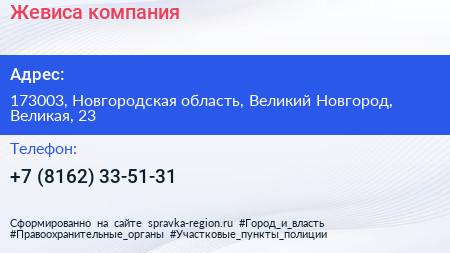 Жевиса, компания по адресу 173003, Новгородская область, Великий Новгород, Великая, 23 в дальнейшем Организация, размещена в следующих категориях:
