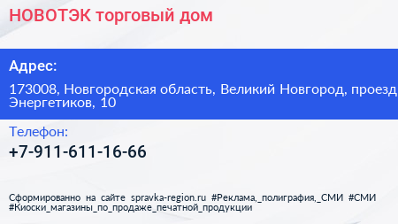 НОВОТЭК, торговый дом по адресу 173008, Новгородская область, Великий Новгород, проезд Энергетиков, 10 в дальнейшем Организация, размещена в следующих категориях: