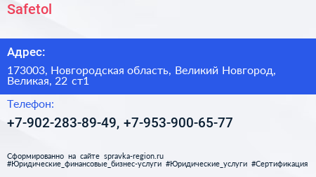 Safetol по адресу 173003, Новгородская область, Великий Новгород, Великая, 22 ст1 в дальнейшем Организация, размещена в следующих категориях: