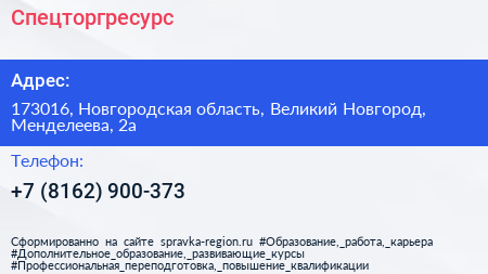 Спецторгресурс по адресу 173016, Новгородская область, Великий Новгород, Менделеева, 2а в дальнейшем Организация, размещена в следующих категориях: