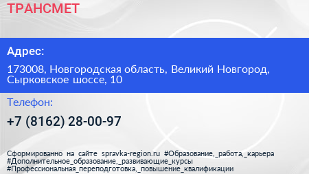 ТРАНСМЕТ по адресу 173008, Новгородская область, Великий Новгород, Сырковское шоссе, 10 в дальнейшем Организация, размещена в следующих категориях: