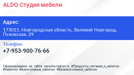ALDO, Студия мебели по адресу 173015, Новгородская область, Великий Новгород, Псковская, 29 в дальнейшем Организация, размещена в следующих категориях: