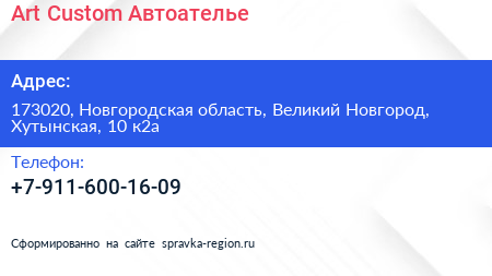 Art Custom Автоателье по адресу 173020, Новгородская область, Великий Новгород, Хутынская, 10 к2а в дальнейшем Организация, размещена в следующих категориях: