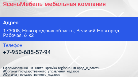 ЯсеньМебель, мебельная компания по адресу 173008, Новгородская область, Великий Новгород, Рабочая, 6 к2 в дальнейшем Организация, размещена в следующих категориях:
