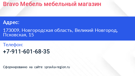 Bravo Мебель, мебельный магазин по адресу 173009, Новгородская область, Великий Новгород, Псковская, 15 в дальнейшем Организация, размещена в следующих категориях: