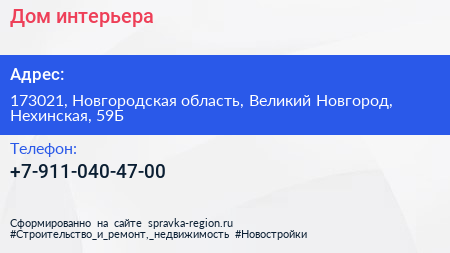Дом интерьера по адресу 173021, Новгородская область, Великий Новгород, Нехинская, 59Б в дальнейшем Организация, размещена в следующих категориях: