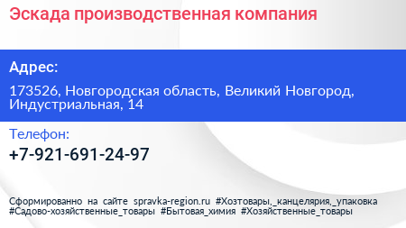Эскада, производственная компания по адресу 173526, Новгородская область, Великий Новгород, Индустриальная, 14 в дальнейшем Организация, размещена в следующих категориях: