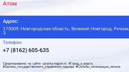 Атом по адресу 173009, Новгородская область, Великий Новгород, Речная, 3 в дальнейшем Организация, размещена в следующих категориях: