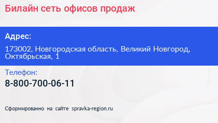Билайн, сеть офисов продаж по адресу 173002, Новгородская область, Великий Новгород, Октябрьская, 1 в дальнейшем Организация, размещена в следующих категориях: