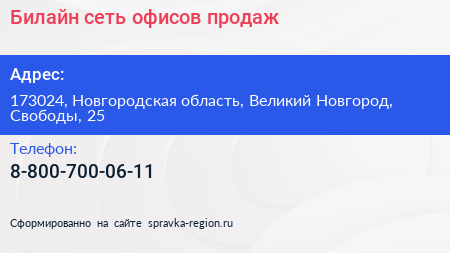 Билайн, сеть офисов продаж по адресу 173024, Новгородская область, Великий Новгород, Свободы, 25 в дальнейшем Организация, размещена в следующих категориях: