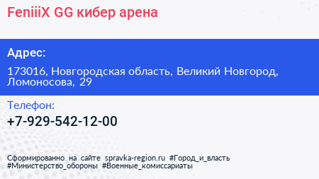 FeniiiX.GG, кибер арена по адресу 173016, Новгородская область, Великий Новгород, Ломоносова, 29 в дальнейшем Организация, размещена в следующих категориях: