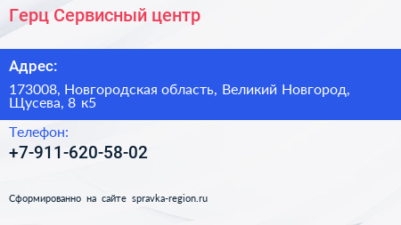 Герц, Сервисный центр по адресу 173008, Новгородская область, Великий Новгород, Щусева, 8 к5 в дальнейшем Организация, размещена в следующих категориях: