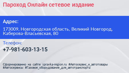 Пароход Онлайн, сетевое издание по адресу 173009, Новгородская область, Великий Новгород, Каберова-Власьевская, 80 в дальнейшем Организация, размещена в следующих категориях: