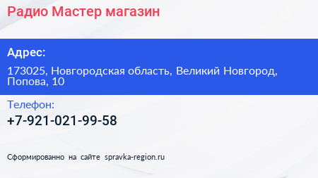 Радио Мастер, магазин по адресу 173025, Новгородская область, Великий Новгород, Попова, 10 в дальнейшем Организация, размещена в следующих категориях: