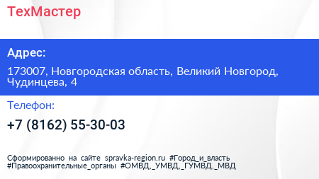 ТехМастер по адресу 173007, Новгородская область, Великий Новгород, Чудинцева, 4 в дальнейшем Организация, размещена в следующих категориях: