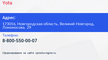 Yota по адресу 173016, Новгородская область, Великий Новгород, Ломоносова, 29 в дальнейшем Организация, размещена в следующих категориях: