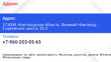 Админ по адресу 173008, Новгородская область, Великий Новгород, Сырковское шоссе, 25/1 в дальнейшем Организация, размещена в следующих категориях: