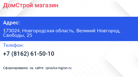 ДомСтрой, магазин по адресу 173024, Новгородская область, Великий Новгород, Свободы, 25 в дальнейшем Организация, размещена в следующих категориях:
