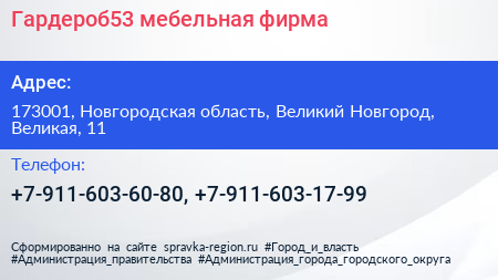 Гардероб53, мебельная фирма по адресу 173001, Новгородская область, Великий Новгород, Великая, 11 в дальнейшем Организация, размещена в следующих категориях: