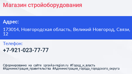 Магазин стройоборудования по адресу 173014, Новгородская область, Великий Новгород, Связи, 12 в дальнейшем Организация, размещена в следующих категориях: