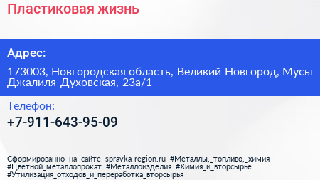 Пластиковая жизнь по адресу 173003, Новгородская область, Великий Новгород, Мусы Джалиля-Духовская, 23а/1 в дальнейшем Организация, размещена в следующих категориях: