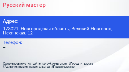 Русский мастер по адресу 173021, Новгородская область, Великий Новгород, Нехинская, 12 в дальнейшем Организация, размещена в следующих категориях: