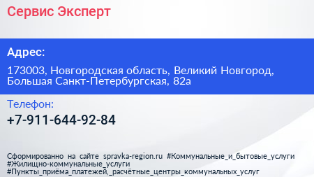 Сервис-Эксперт по адресу 173003, Новгородская область, Великий Новгород, Большая Санкт-Петербургская, 82а в дальнейшем Организация, размещена в следующих категориях: