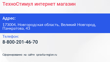 ТехноСтимул, интернет-магазин по адресу 173004, Новгородская область, Великий Новгород, Панкратова, 43 в дальнейшем Организация, размещена в следующих категориях: