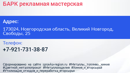 БАРК, рекламная мастерская по адресу 173024, Новгородская область, Великий Новгород, Свободы, 25 в дальнейшем Организация, размещена в следующих категориях: