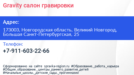Gravity, салон гравировки по адресу 173003, Новгородская область, Великий Новгород, Большая Санкт-Петербургская, 25 в дальнейшем Организация, размещена в следующих категориях: