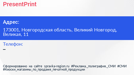 PresentPrint по адресу 173001, Новгородская область, Великий Новгород, Великая, 11 в дальнейшем Организация, размещена в следующих категориях: