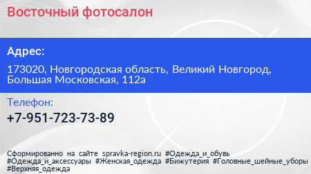 Восточный, фотосалон по адресу 173020, Новгородская область, Великий Новгород, Большая Московская, 112а в дальнейшем Организация, размещена в следующих категориях: