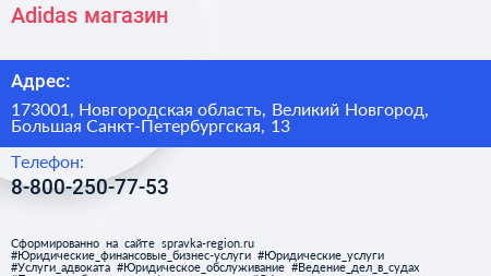 Adidas, магазин по адресу 173001, Новгородская область, Великий Новгород, Большая Санкт-Петербургская, 13 в дальнейшем Организация, размещена в следующих категориях: