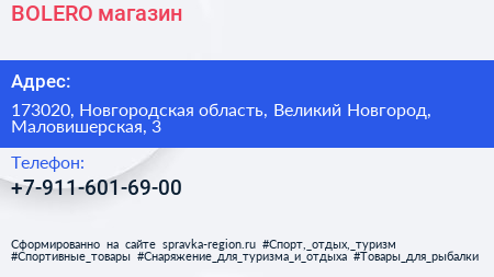 BOLERO, магазин по адресу 173020, Новгородская область, Великий Новгород, Маловишерская, 3 в дальнейшем Организация, размещена в следующих категориях: