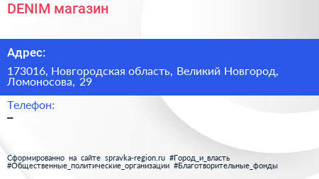 DENIM, магазин по адресу 173016, Новгородская область, Великий Новгород, Ломоносова, 29 в дальнейшем Организация, размещена в следующих категориях: