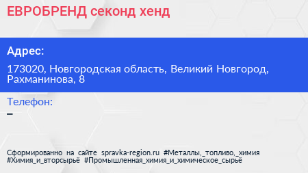 ЕВРОБРЕНД, секонд-хенд по адресу 173020, Новгородская область, Великий Новгород, Рахманинова, 8 в дальнейшем Организация, размещена в следующих категориях: