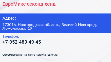 ЕвроМикс, секонд-хенд по адресу 173016, Новгородская область, Великий Новгород, Ломоносова, 19 в дальнейшем Организация, размещена в следующих категориях:
