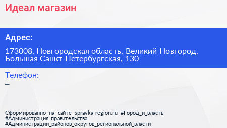 Идеал, магазин по адресу 173008, Новгородская область, Великий Новгород, Большая Санкт-Петербургская, 130 в дальнейшем Организация, размещена в следующих категориях: