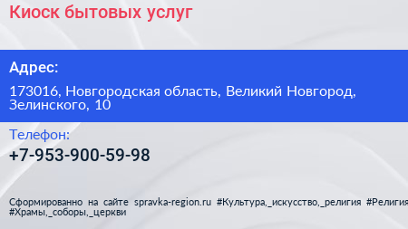 Киоск бытовых услуг по адресу 173016, Новгородская область, Великий Новгород, Зелинского, 10 в дальнейшем Организация, размещена в следующих категориях:
