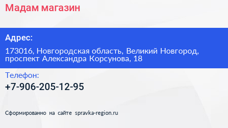 Мадам, магазин по адресу 173016, Новгородская область, Великий Новгород, проспект Александра Корсунова, 18 в дальнейшем Организация, размещена в следующих категориях: