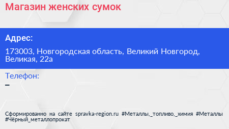 Магазин женских сумок по адресу 173003, Новгородская область, Великий Новгород, Великая, 22а в дальнейшем Организация, размещена в следующих категориях: