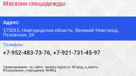 Магазин спецодежды по адресу 173015, Новгородская область, Великий Новгород, Псковская, 24 в дальнейшем Организация, размещена в следующих категориях: