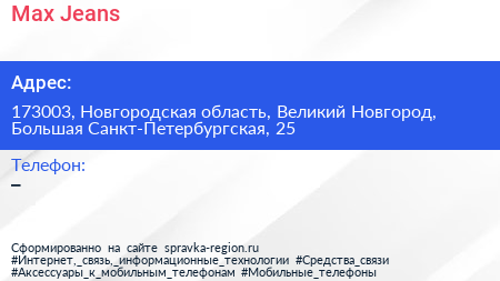 Max Jeans по адресу 173003, Новгородская область, Великий Новгород, Большая Санкт-Петербургская, 25 в дальнейшем Организация, размещена в следующих категориях: