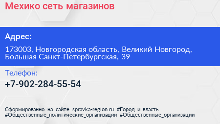 Мехико, сеть магазинов по адресу 173003, Новгородская область, Великий Новгород, Большая Санкт-Петербургская, 39 в дальнейшем Организация, размещена в следующих категориях: