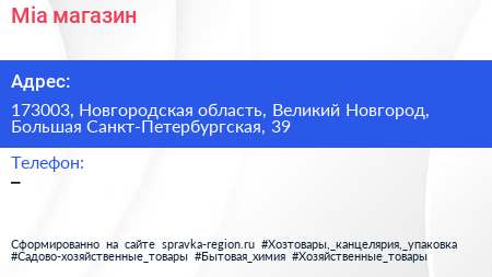 Mia, магазин по адресу 173003, Новгородская область, Великий Новгород, Большая Санкт-Петербургская, 39 в дальнейшем Организация, размещена в следующих категориях: