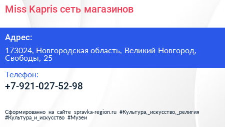 Miss Kapris, сеть магазинов по адресу 173024, Новгородская область, Великий Новгород, Свободы, 25 в дальнейшем Организация, размещена в следующих категориях: