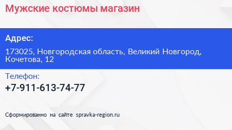 Мужские костюмы, магазин по адресу 173025, Новгородская область, Великий Новгород, Кочетова, 12 в дальнейшем Организация, размещена в следующих категориях: