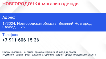 НОВГОРОДОЧКА, магазин одежды по адресу 173024, Новгородская область, Великий Новгород, Свободы, 25 в дальнейшем Организация, размещена в следующих категориях:
