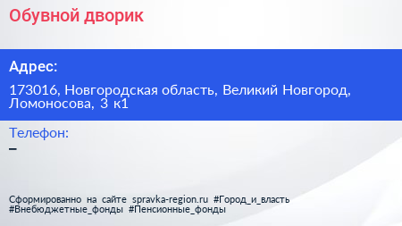 Обувной дворик по адресу 173016, Новгородская область, Великий Новгород, Ломоносова, 3 к1 в дальнейшем Организация, размещена в следующих категориях: