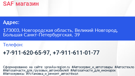 SAF, магазин по адресу 173003, Новгородская область, Великий Новгород, Большая Санкт-Петербургская, 39 в дальнейшем Организация, размещена в следующих категориях: